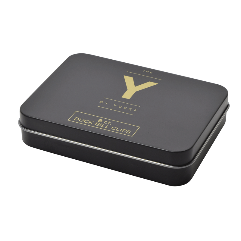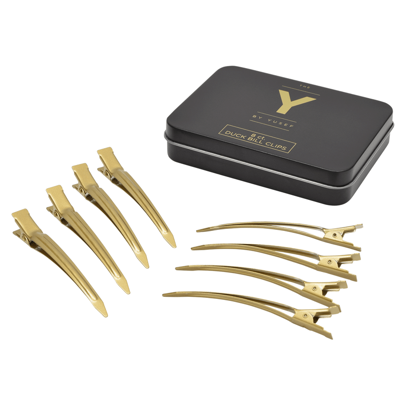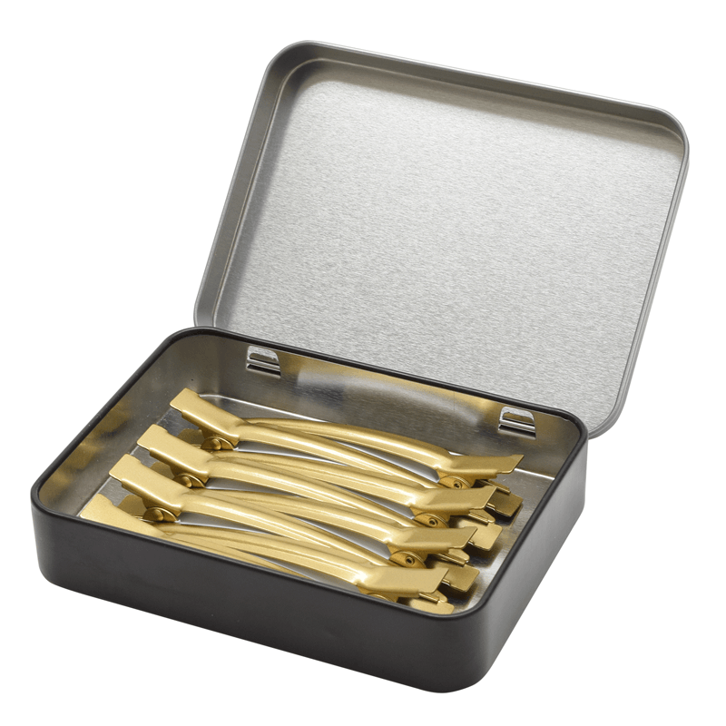 Duckbill clips are versatile tools for sectioning, securing, styling and creating brilliant hair! Long, slim, brushed metal gold clips are slightly curved to contour to the head. Durable and flexible, they firmly grip the hair and are ideal for sectioning hair while cutting, styling, or keeping hair off the face during a makeup application. Can also be used to secure curlers or keep foils in place. Stored in a trendy, black metal box that is convenient for travel. 8 clips per kit.